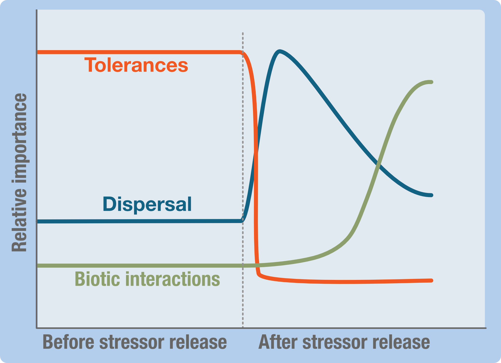 As the central tenet of the ARC, the significance of tolerances, dispersal and biotic interactions differs fundamentally between phases of degradation and recovery. The shifting importance of these mechanisms creates asymmetries between the ecological trajectories that follow increasing and decreasing stressor intensities. This recognition helps to understand multiple stressors’ impacts and to predict which measures will restore communities that are resistant to restoration.