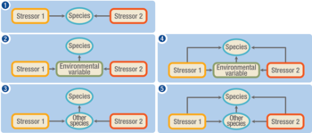 - Indirect effects through an abiotic environmental variable: Both stressors jointly affect an environmental variable that in turn affects a focal species.